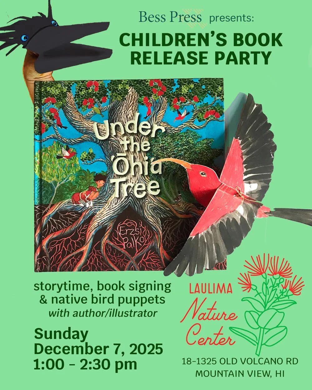 Celebrate the launch of Under the ʻŌhiʻa Tree, a new picture book from Bess Press with a storytime, book signing, and puppet making activity! Join author & illustrator Erzsi Palko to learn about our beloved ʻōhiʻa trees, remaining forest birds, and many other forest friends.
